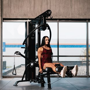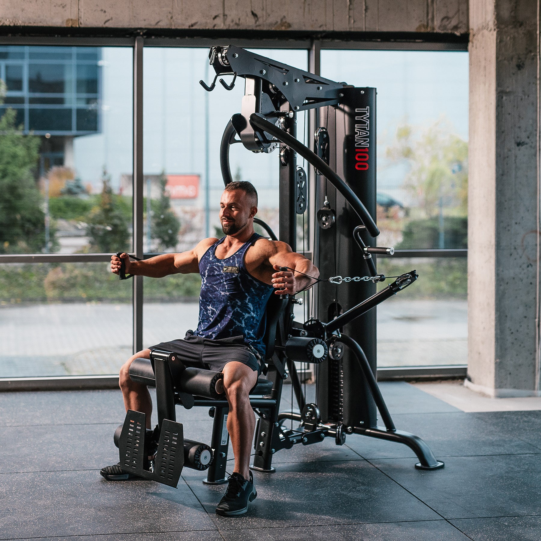 TYTAN 100 zastępuje kilka maszyn i daje dostęp do pełnego wachlarza ćwiczeń. Wyciąg górny idealnie sprawdza się w treningu pleców i brzucha, a dolny umożliwia mocne, stabilne wiosłowanie z oparciem na antypoślizgowej platformie. Ramiona do rozpiętek i wyciskania pozwalają na trening klatki w różnych ustawieniach, a prasa do nóg zapewnia skuteczną pracę przedniej części ud.