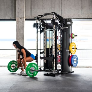 Największym atutem Cyklopa 10 jest możliwość pracy na suwnicy Smitha z obciążeniem stosu, talerzami lub… obiema opcjami jednocześnie. To rozwiązanie daje pełnię swobody - od technicznej nauki wzorca ruchowego po ciężkie serie siłowe. Stalowe prowadnice gwarantują płynny, stabilny tor ruchu, a blokady bezpieczeństwa zapewniają spokój nawet przy treningu do końca możliwości.