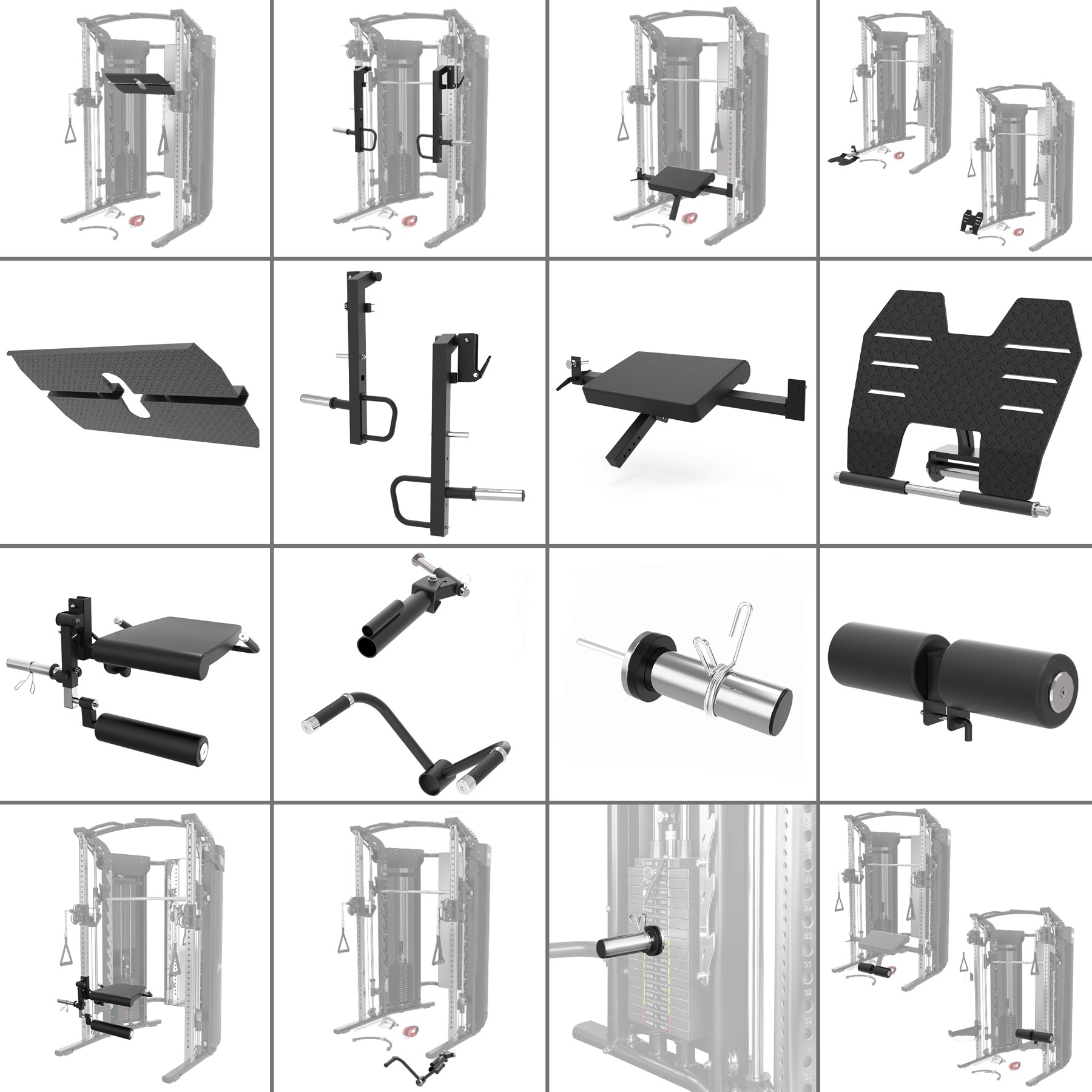 Cyklop 10 został stworzony dla tych, którzy chcą wykonywać cały plan treningowy w jednym miejscu. Podciąganie, przysiady, wyciskanie, martwy ciąg, rozpiętki, ściąganie drążka, wiosłowanie, linki jednoręczne, praca funkcjonalna - tutaj wszystko jest możliwe. Ruchome ramiona (jammer arms), płyta do nóg, siedzisko, landmine, uchwyty do dipów oraz cała gama końcówek do wyciągów otwierają ogromną liczbę wariantów ćwiczeń dla każdej grupy mięśniowej. To prawdziwa stacja „full-body”, której możliwości rosną wraz z Twoją kreatywnością.