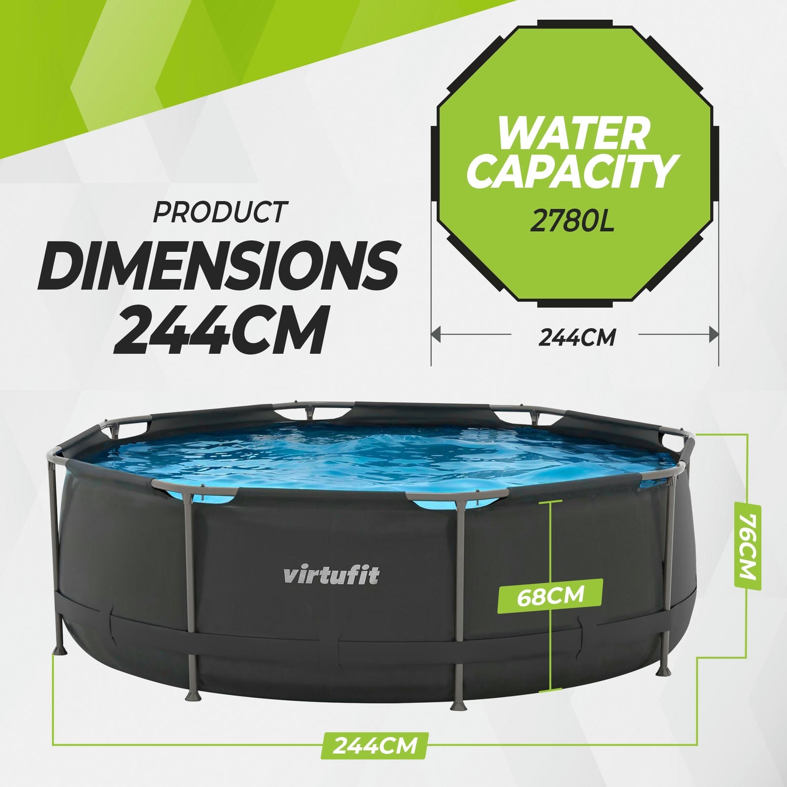 Jeśli szukasz basenu, który oferuje kompaktowy rozmiar, stabilną konstrukcję, trwałe materiały i pompę filtrującą w zestawie, VirtuFit VF13001 244 cm będzie idealnym wyborem na lato.