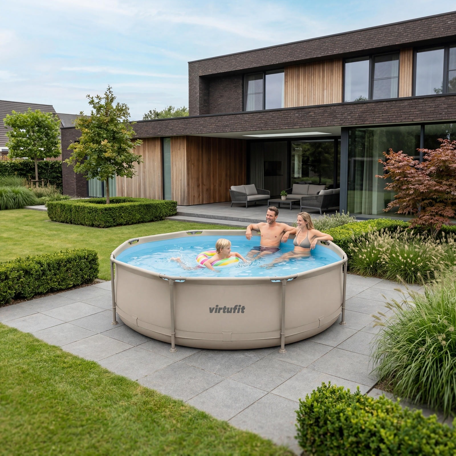 Nowoczesny antracytowy kolor sprawia, że basen dobrze komponuje się z otoczeniem i wpisuje się w estetykę współczesnych ogrodów. To nie tylko funkcjonalny element, ale też spójne uzupełnienie przestrzeni wypoczynkowej.