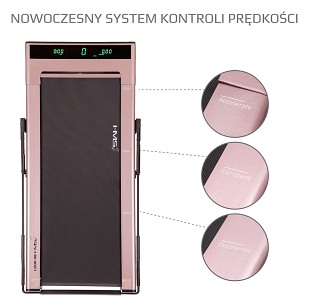 Bez wątpienia Loop Walk 08 to najbardziej instynktowną bieżnią dostępną na rynku. Sterowanie prędkością jest niezwykle proste. Wystarczy wejść na pas biegowy, aby nowoczesny system kontroli prędkości wprawił bieżnię w ruch. Szybszy bieg i bliższa odległość ćwiczącego względem przedniego panelu urządzenia, zwiększy prędkość. Boczne czujniki ruchu umieszczone na długości pasa biegowego, będą kontrolować pozycję Twojego ciała. Gdy zwolnisz i zaczniesz oddalać się od wyświetlacza, komputer otrzyma sygnał, aby zmniejszył prędkość. Bieżnia osiągna prędkość maksymalną do 8km/h.