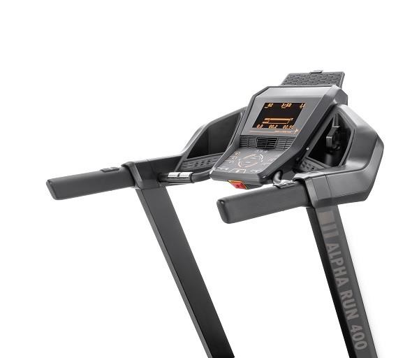 Kettler Bieżnia Alpha Run 400 została wyposażona w wysokiej jakości komputer treningowy z intuicyjnym menu nawigacyjnym dostępnym w 3 językach (niemieckim, angielskim i francuskim). Wielkość wyświetlacza to 190x110 mm, co sprawia, że nawet podczas intensywnego treningu najważniejsze parametry pozostają czytelne. Komputer posiada 32 wbudowane programy treningowe, dzięki którym możliwe jest dopasowanie intensywności treningu do sprawności i kondycji użytkownika. Bieżnia umożliwia regulację kąta nachylenia pasa biegowego w zakresie od 0 do 12% oraz prędkości w zakresie 1 – 20 km/h. Na komputerze możliwe jest także zdefiniowanie 4 użytkowników. Podczas treningu wyświetlane są informacje o czasie, pokonanym dystansie, prędkości, tętnie, kącie nachylenia i spalonych kaloriach. Sensory dotykowe umieszone na uchwytach przy komputerze umożliwiają pomiar tętna. Istnieje również wyboru programu treningowego, który sterowany jest tętnem a dzięki wbudowanemu Bluetooth bieżnia Alpha Run 400 posiada możliwość połączenia się z aplikacją Kinomap oraz innymi urządzeniami czy aplikacjami