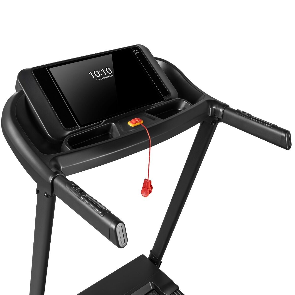 Bieżnia HYPE została zaprojektowana z myślą o oszczędności miejsca – można ją złożyć i przechowywać w pozycji pionowej, a kółka transportowe ułatwiają jej przemieszczanie. Praktyczne detale, takie jak uchwyt na tablet i butelkę, podnoszą komfort korzystania z bieżni, a klucz bezpieczeństwa zapewnia dodatkową ochronę podczas treningu.