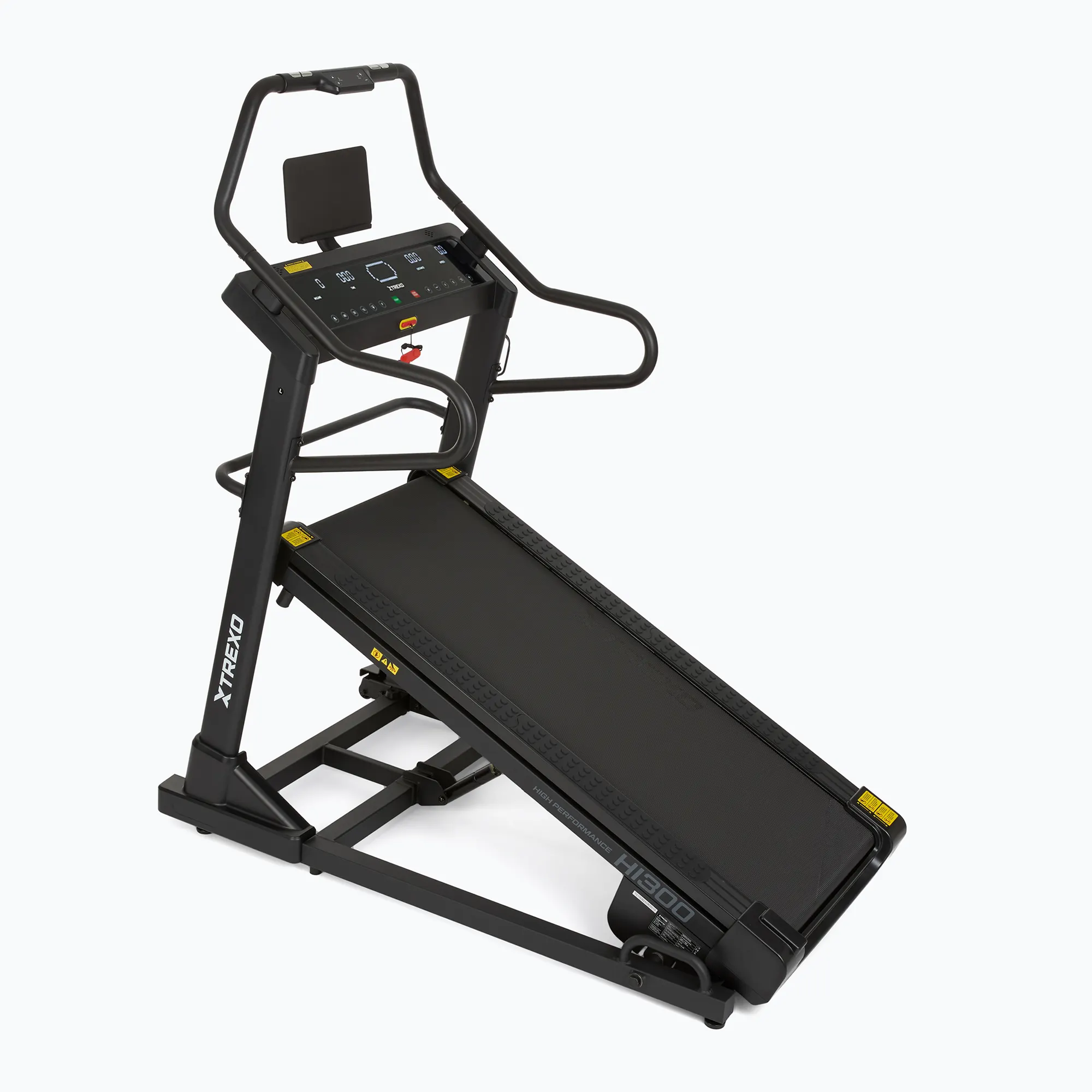 Trexo HI300 High Incline Black to bieżnia stworzona z myślą o stabilności i wygodzie. Mocna, stalowa konstrukcja zapewnia pełne bezpieczeństwo nawet przy maksymalnym nachyleniu, a ergonomiczne uchwyty gwarantują pewny chwyt podczas treningu wspinaczkowego.