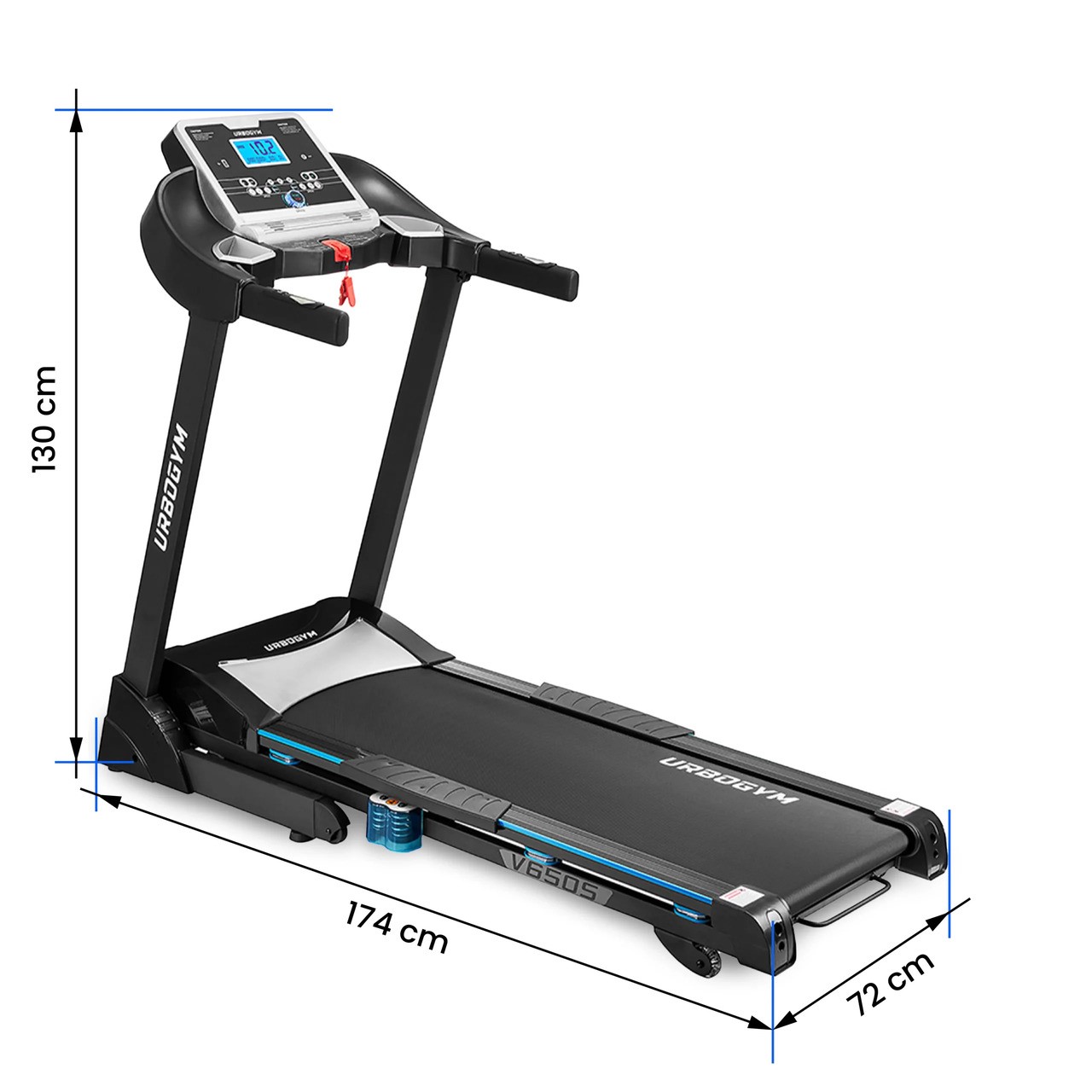 Aby chronić stawy i zwiększyć komfort biegu, V650S została wyposażona w 8-punktowy system amortyzacji, który redukuje wstrząsy nawet przy mocniejszym wysiłku. Po zakończonym treningu bieżnię można złożyć dzięki teleskopowemu systemowi składania (system z siłownikiem gazowym), co znacząco oszczędza przestrzeń - po złożeniu zajmuje mniej niż 1 m². Kółka transportowe ułatwiają przestawienie urządzenia w inne miejsce, gdy potrzebujesz wolnej przestrzeni.