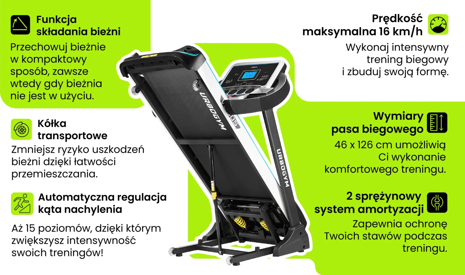 UrboGym V660S została stworzona dla tych, którzy chcą trenować wygodnie i efektywnie. System amortyzacji chroni stawy i pozwala skupić się na ruchu, a składana konstrukcja z siłownikiem gazowym sprawia, że sprzęt doskonale wpisuje się w rytm domowego życia. Po skończonym treningu złożysz bieżnię w kilka sekund i wrócisz do codzienności - z poczuciem, że zrobiłeś coś dobrego dla siebie.