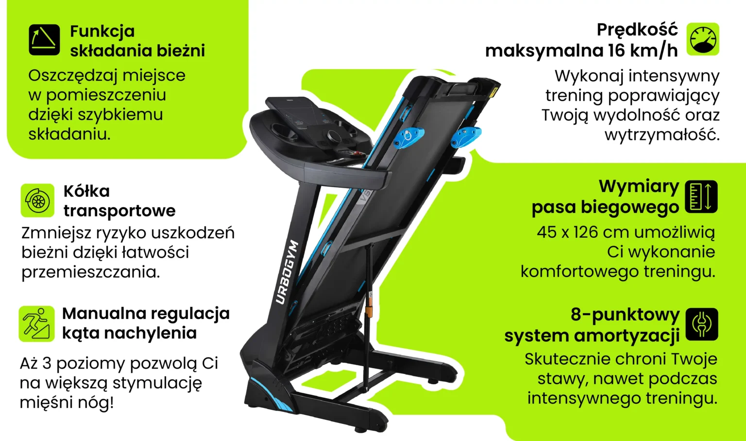 Ta bieżnia to idealne połączenie technologii, designu i wygody. UrboGym V680 to nie tylko sprzęt fitness, ale narzędzie, które ułatwia Ci dbałość o zdrowie i formę bez wychodzenia z domu. Doskonała amortyzacja, 24 programy treningowe, wytrzymała konstrukcja i intuicyjna obsługa sprawiają, że z każdym dniem trening staje się naturalną częścią życia. Postaw na jakość, która motywuje - wybierz UrboGym V680 i przekonaj się, jak dobrze może działać codzienny ruch.
