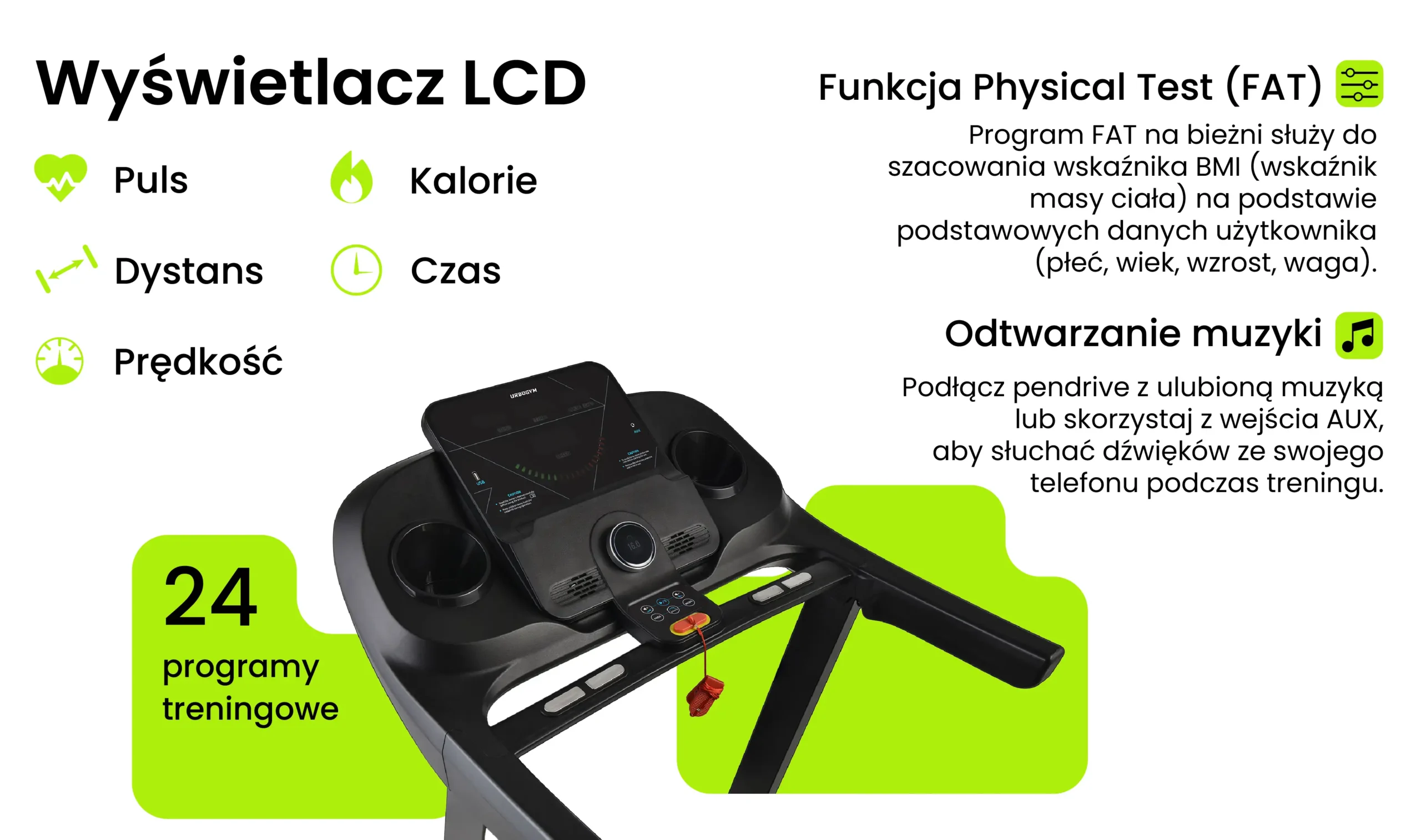 | Funkcja pauzy | wprowadzona w 2025 (bieżnia kupiona wcześniej jej nie posiada) - możliwość tymczasowego zatrzymania treningu bez utraty dotychczasowych postępów |