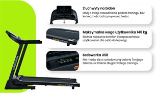 Szeroki, antypoślizgowy pas biegowy o wymiarach 130 x 50 cm gwarantuje komfort i swobodę ruchów podczas biegu. Taka przestrzeń pozwala na naturalne i pewne stawianie kroków, minimalizując ryzyko kontuzji.