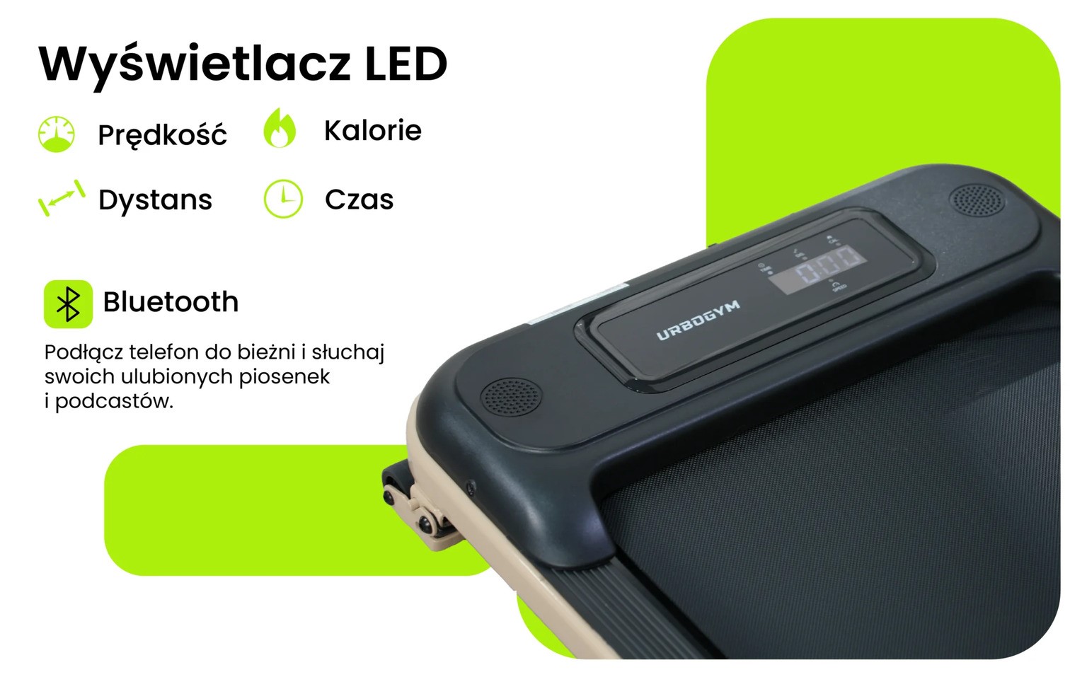 Czytelny wyświetlacz LED umieszczony w pokrywie silnika prezentuje najważniejsze parametry treningu, takie jak prędkość, dystans, czas oraz spalone kalorie. Bieżnia została również wyposażona w głośniki Bluetooth, które umożliwiają odtwarzanie muzyki, podcastów lub innych materiałów audio bezpośrednio z telefonu. Dzięki temu codzienny spacer może stać się przyjemnym elementem dnia.