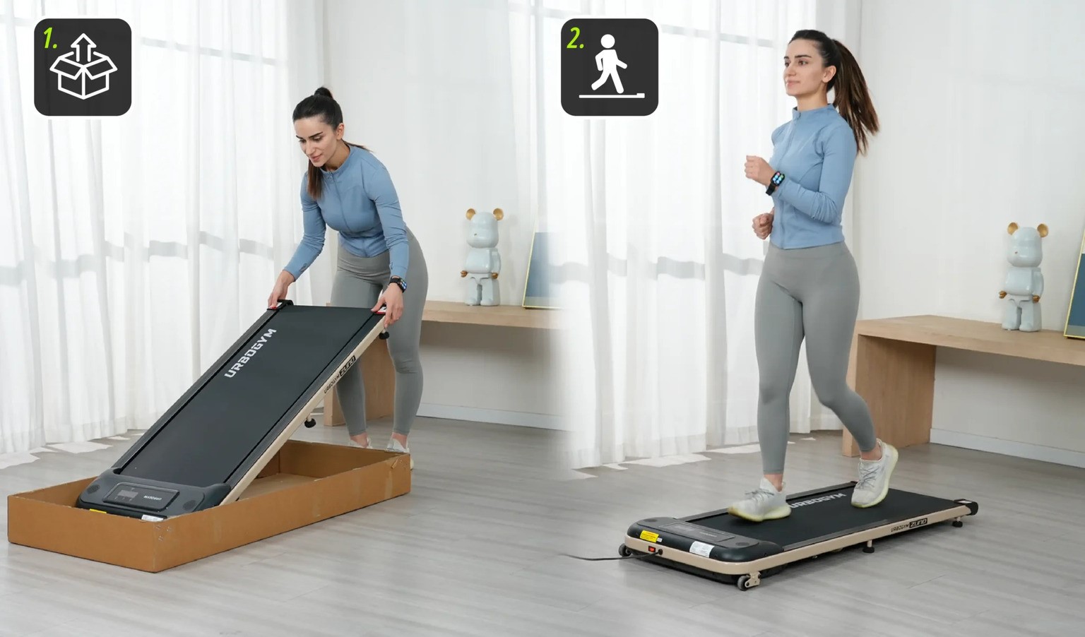UrboGym Zuno jest w pełni gotowa do działania już po wyjęciu z opakowania - nie wymaga skomplikowanego montażu ani skręcania elementów. Lekka konstrukcja oraz wbudowane kółka transportowe pozwalają łatwo przemieszczać bieżnię między pomieszczeniami. Możesz trenować w salonie, sypialni lub domowym biurze, a po zakończonym treningu szybko schować urządzenie pod meblem.