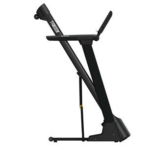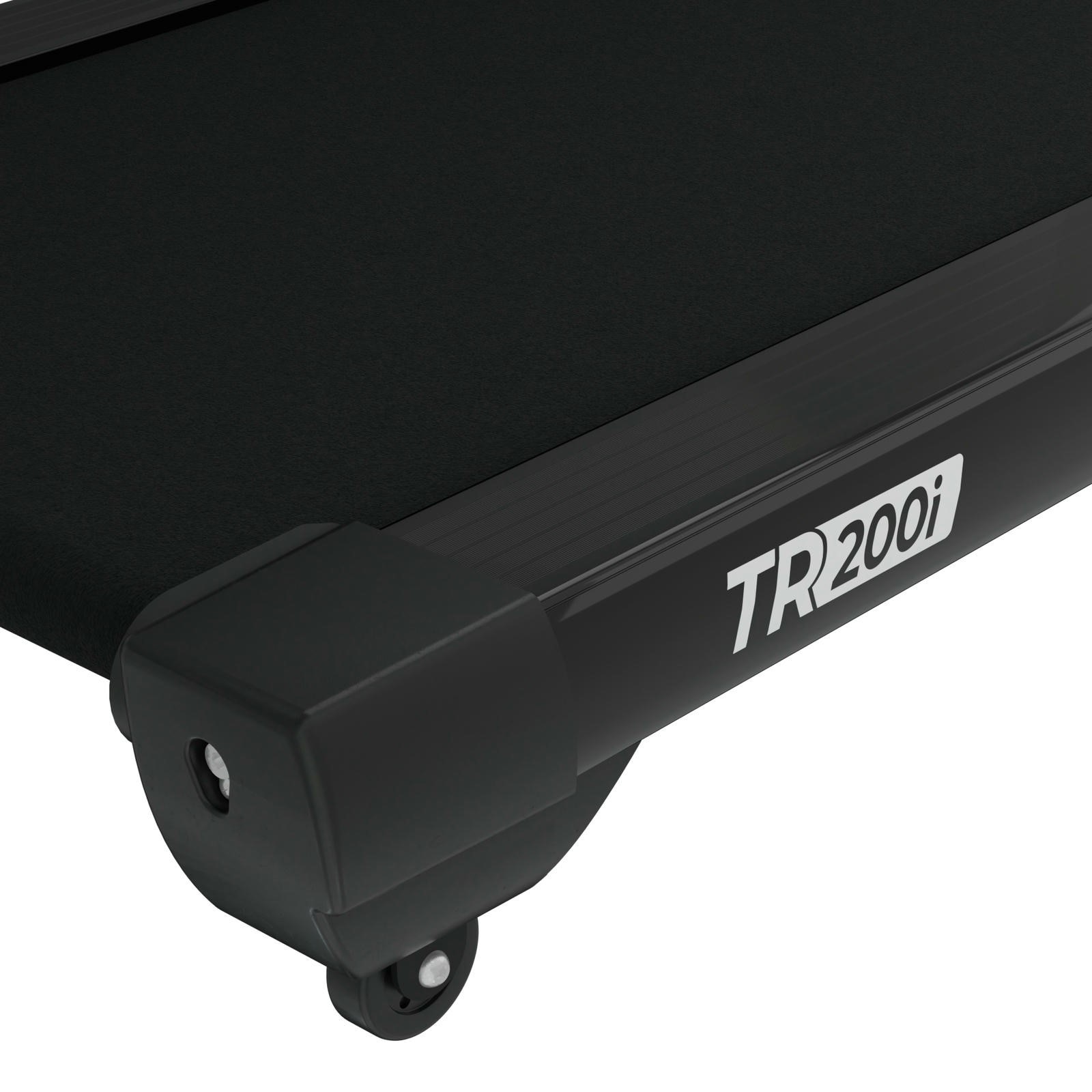 Po zakończonym treningu bieżnię TR200i można łatwo złożyć za pomocą praktycznego mechanizmu składania. W pozycji złożonej zajmuje niewiele miejsca, co pozwala wygodnie przechowywać ją w mieszkaniu. Wbudowane kółka transportowe ułatwiają przemieszczanie jej w pomieszczeniu.