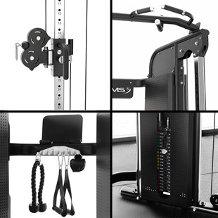 | W zestawie | para uchwytów typu D-handle, sznur do tricepsa, opaska na kostkę i nadgarstek, długi drążek prosty długi drążek łamany uchwyty do przechowywania akcesoriów, zintegrowana półka na tablet i telefon (np. do treningów online lub aplikacji fitness). wszystkie dodatki mają dedykowane miejsce w konstrukcji, co ułatwia organizację przestrzeni treningowej. |