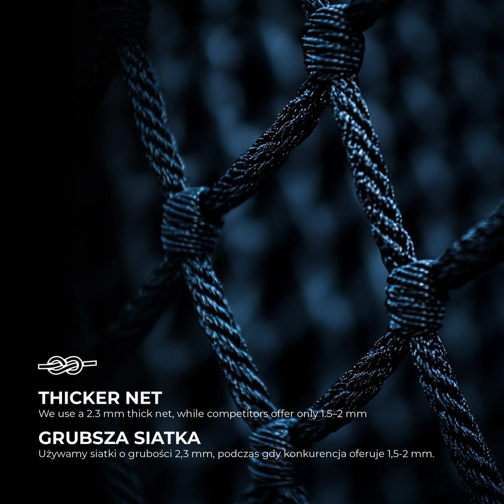 Wytrzymała siatka o zwiększonej grubości dobrze znosi intensywne użytkowanie i częste uderzenia piłki. System mocowania sprawia, że jej montaż jest szybki i prosty, a całość tworzy spójną, funkcjonalną konstrukcję gotową do gry od pierwszych minut.