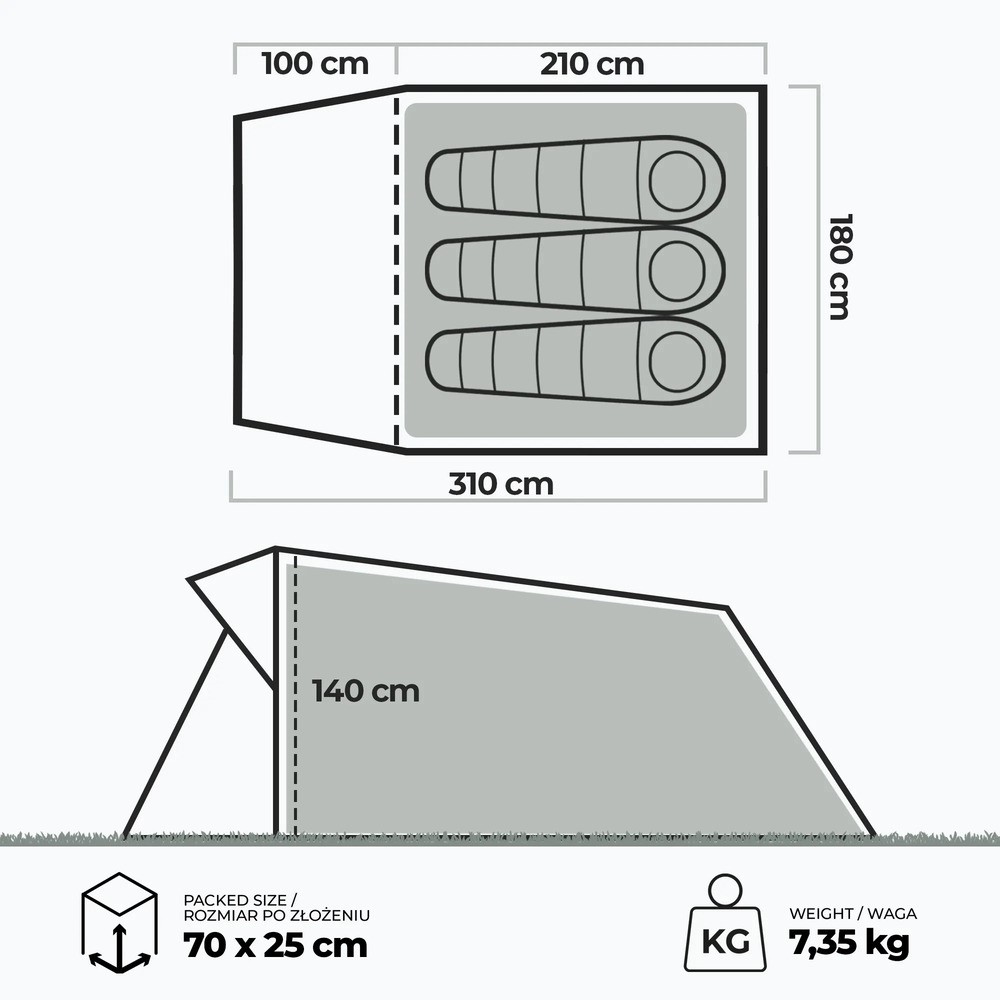 Wypoczynek pod namiotem powinien dawać swobodę - i właśnie dlatego Kadva AIRcamp 3 oferuje wygodną przestrzeń do spania dla trzech osób. To model, który dobrze sprawdzi się podczas weekendowych wyjazdów, rodzinnych campingów i wakacyjnych pobytów na jednym miejscu. Wnętrze zostało zaprojektowane tak, aby zapewnić wygodę nie tylko nocą, ale też podczas codziennego korzystania z namiotu.