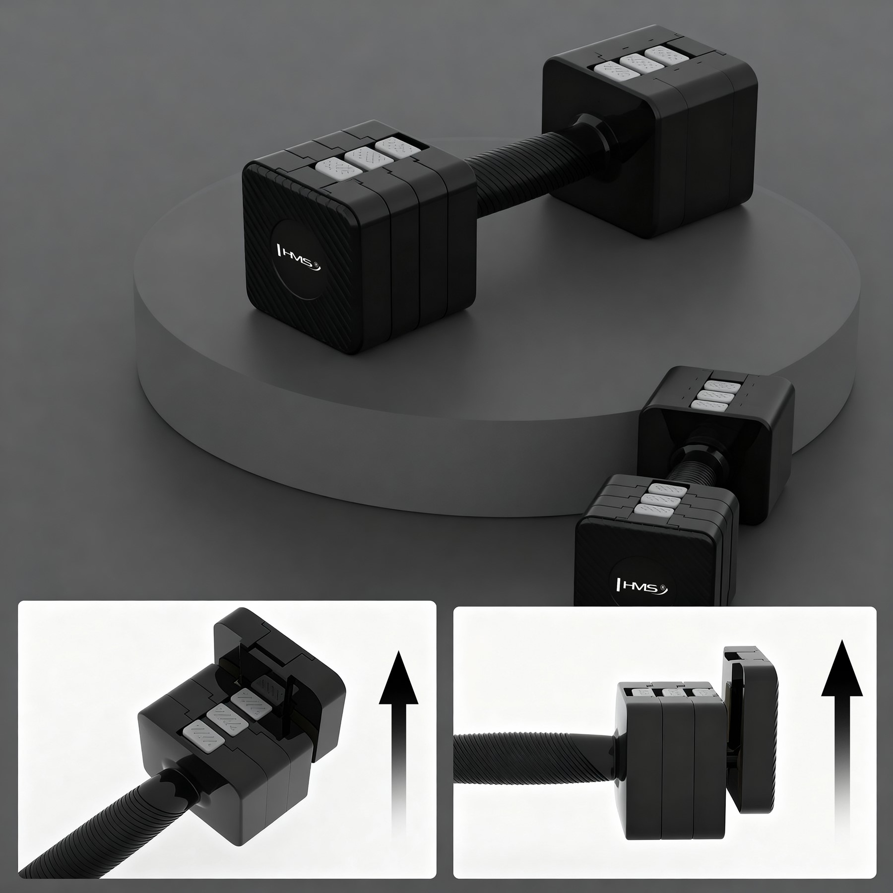 Ergonomiczny uchwyt z antypoślizgową fakturą, trwała powłoka ABS i mechanizm blokujący segmenty gwarantują pewny chwyt i bezpieczną pracę. Kwadratowe końcówki zwiększają stabilność przy odkładaniu hantli i podczas ćwiczeń w podporze.