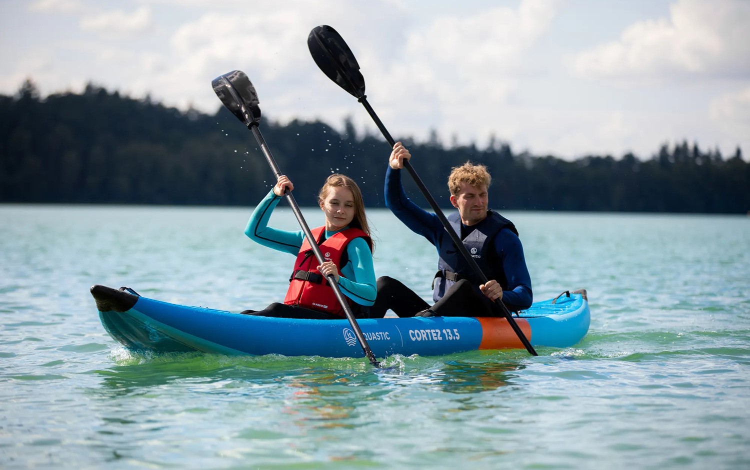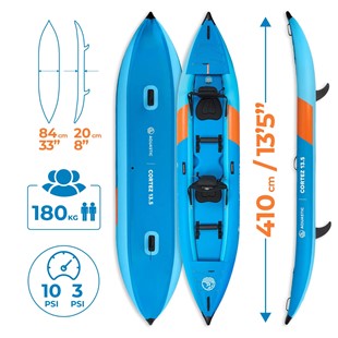 Kajak został zaprojektowany tak, aby zapewniać pewne i komfortowe prowadzenie na wodzie. Hybrydowa konstrukcja z wysokociśnieniowym dnem wykonanym w technologii drop stitch poprawia sztywność całego modelu i przekłada się na bardziej stabilne zachowanie podczas pływania. To szczególnie ważne, gdy na pokładzie znajdują się dwie osoby - dzięki temu kajak prowadzi się pewnie, a wspólne wiosłowanie staje się bardziej naturalne i przyjemne.