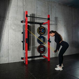 Konstrukcja klatki została uzupełniona o dedykowane miejsce do przechowywania gryfu, co ułatwia organizację sprzętu i pozwala zachować porządek w przestrzeni treningowej. To praktyczne rozwiązanie szczególnie doceniane w domowych siłowniach.