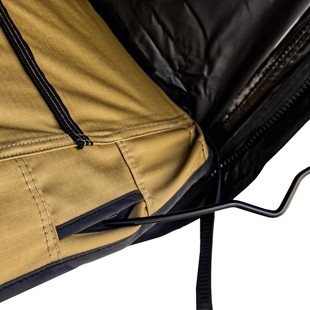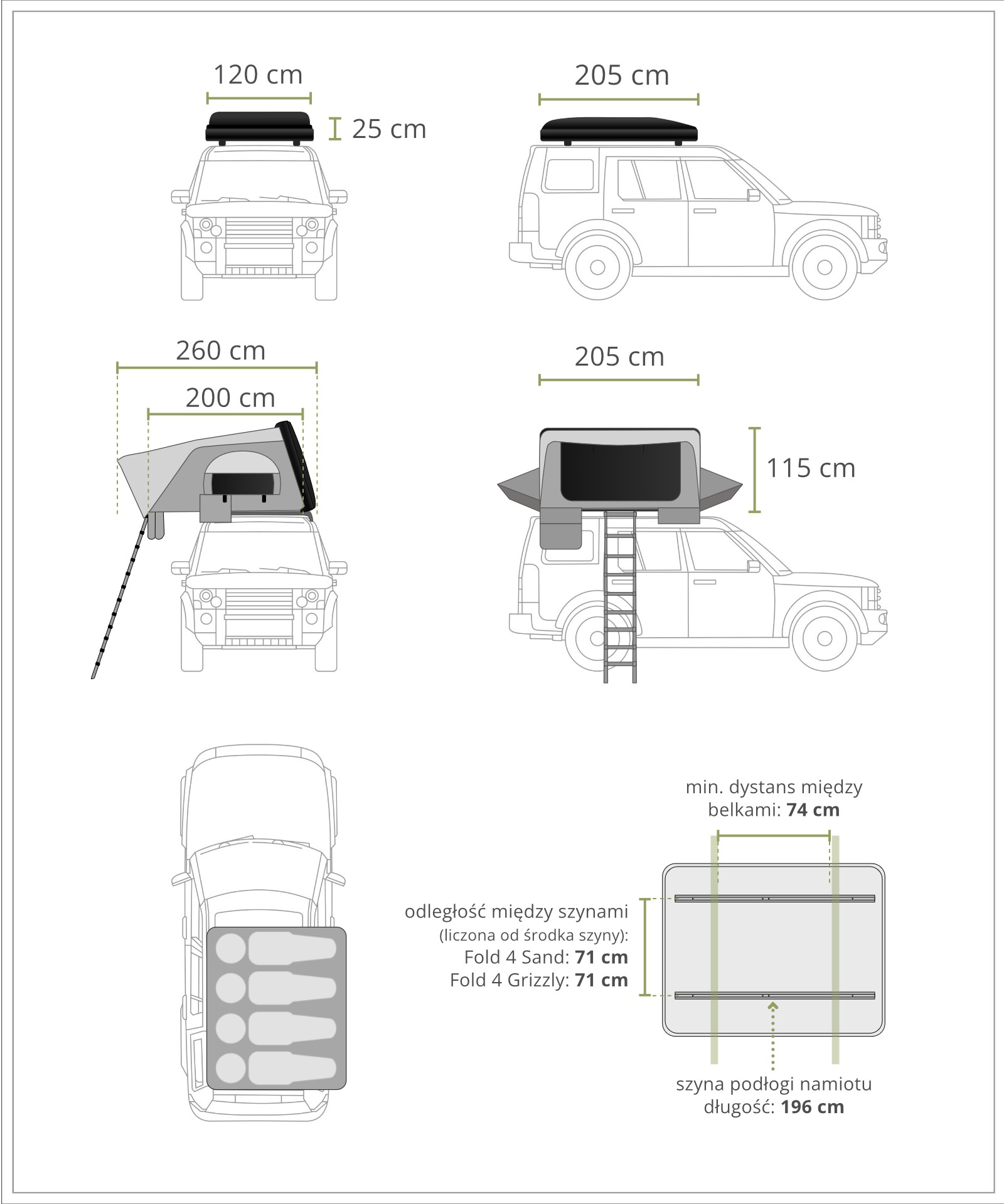 FOLD 4 Sand świetnie prezentuje się na samochodzie. To chyba jedyny namiot na rynku, który po złożeniu ma tylko 120 cm szerokości, co oznacza, że w przypadku 99% samochodów nie będzie wystawać poza obrys samochodu. To nie tylko estetyka, ale i aerodynamika. Wysokość złożonego namiotu to tylko 25 cm. Dzięki temu bez względu na to, czy planujesz umieścić go na Pick-upie, SUVie, Vanie czy samochodzie osobowym, jego kształt nie utrudni Ci jazdy.