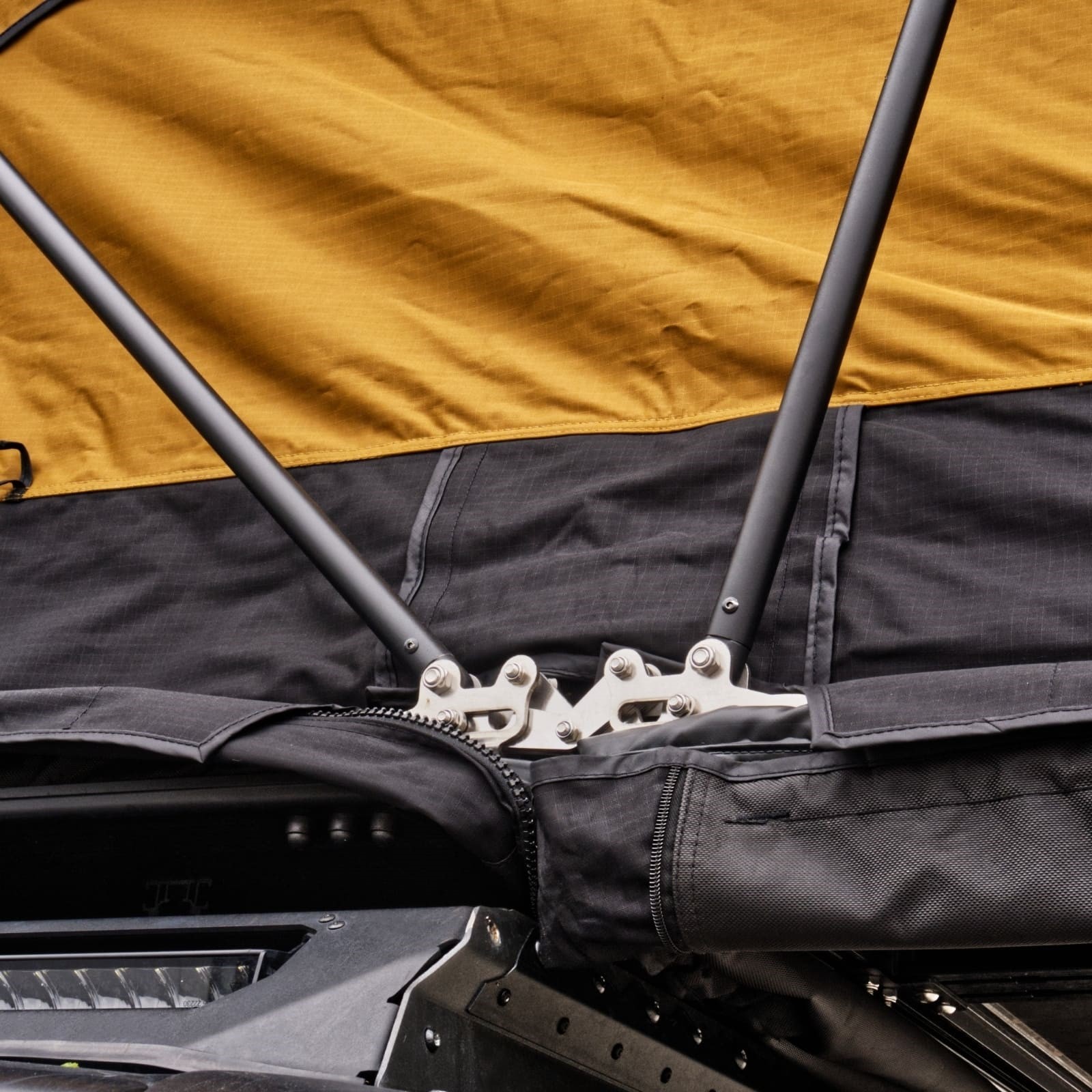 TIP: Pamiętaj, aby po zamknięciu namiotu odczepić drabinkę, zanim wyruszysz w drogę. Jest ona doczepiona prostymi w obsłudze zatrzaskami, które stabilnie utrzymują ją w miejscu, gdy namiot jest otwarty, a także umożliwiają szybkie odczepienie, gdy wyruszasz dalej w drogę.