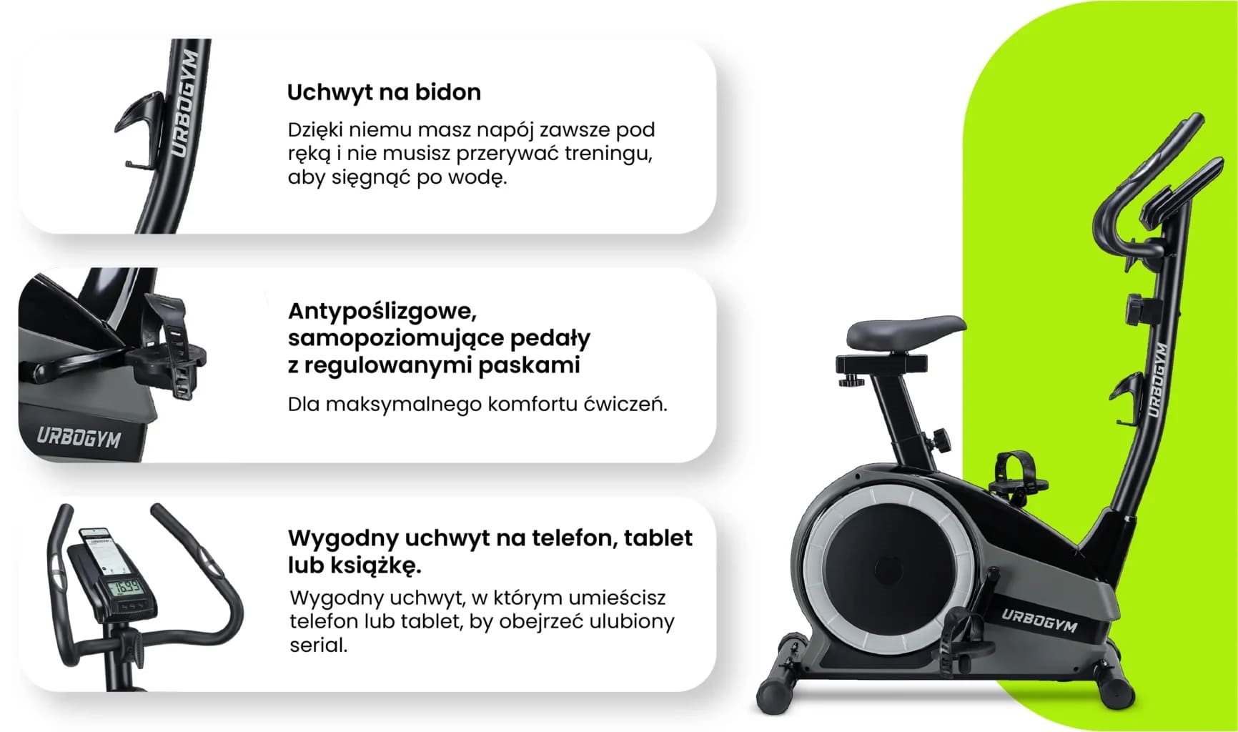 Dla Twojej wygody model BOOZE został wyposażony w uchwyt na bidon zlokalizowany na słupku kierownicy. Pozwala on łatwo i szybko nawodnić organizm podczas treningu bez konieczności jego przerywania. Maksymalne bezpieczeństwo zapewniają samopoziomujące pedały z antypoślizgową powierzchnią. Dzięki nim możesz ćwiczyć pewnie i stabilnie bez obaw o wyślizgnięcie się stopy, nawet przy bardzo szybkim pedałowaniu.