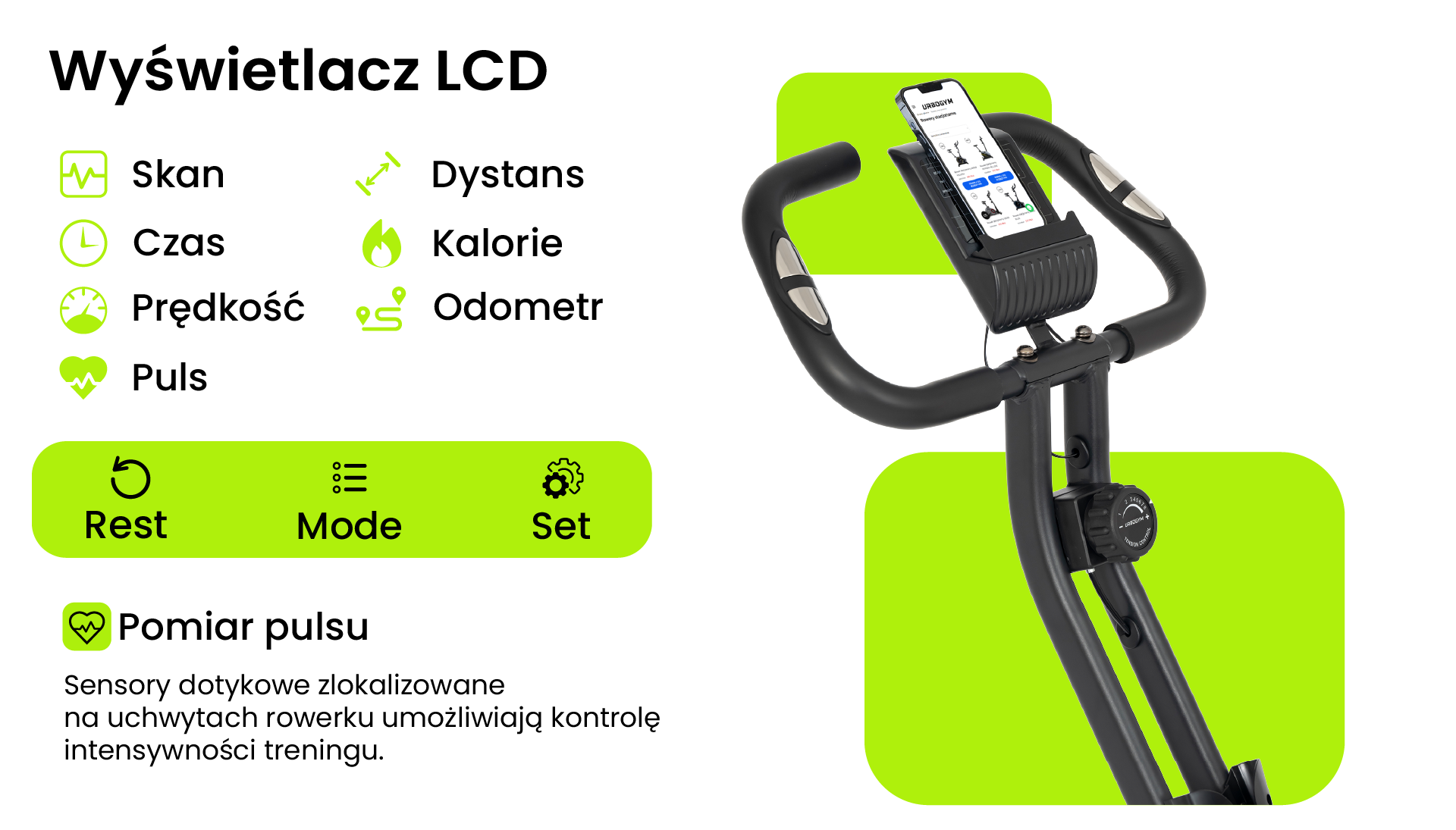 UrboGym zadbał o detale, które robią różnicę. Samopoziomujące, antypoślizgowe pedały z regulowanymi paskami utrzymują stopy pewnie na miejscu. Dotykowe sensory pulsu na kierownicy pozwalają kontrolować tętno, a czytelny wyświetlacz LCD prezentuje wszystkie kluczowe parametry treningu - czas, dystans, prędkość i spalone kalorie. Do tego uchwyt na bidon i na telefon lub tablet sprawiają, że możesz trenować tak, jak lubisz - z ulubioną muzyką, serialem czy audiobookiem.