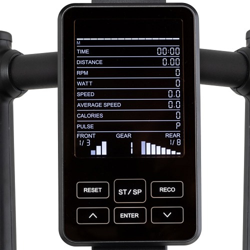 Elegancki rower treningowy inSPORTline inCondi S200i został zaprojektowany do symulacji jazdy na rowerze szosowym, uwzględniając w tym zmianę biegów. Na kierownicy możesz przełączać się między 3 różnymi biegami na „przednim kole” i 8 na „tylnym kole”, co daje w sumie 24 symulowane biegi do wyboru. System ten jest napędzany 9-kilogramowym tylnym kołem zamachowym oraz przednim kołem pasowym z paskiem. Magnetyczny układ hamulcowy pozwala na płynną regulację oporu.