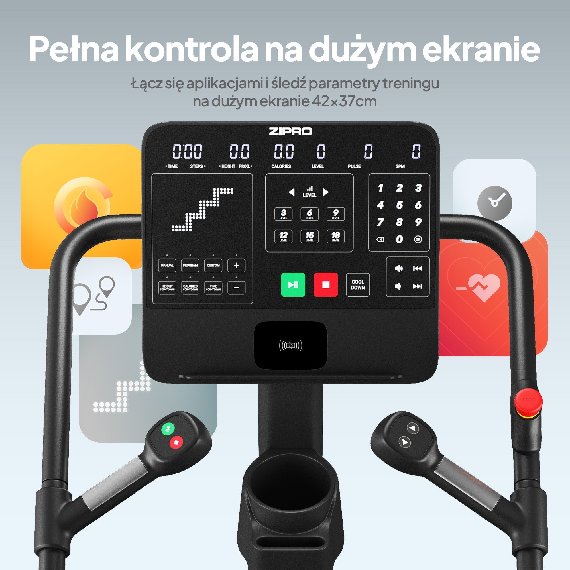 Czytelny panel LED pokazuje wszystkie najważniejsze parametry w jednym miejscu - czas, tempo, ilość kroków i spalone kalorie. Masz pełną kontrolę nad intensywnością, bez rozpraszania się i bez przerywania treningu. Przycisk bezpieczeństwa i ergonomiczne uchwyty sprawiają, że możesz w pełni skupić się na pracy nóg.