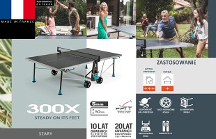 Stół tenisowy 300X marki Cornilleau to model przeznaczony do użytku zewnętrznego. Jest odporny na różnorodne warunki atmosferyczne dlatego bez obaw możesz przechowywać go na zewnątrz. Stół będzie świetnie sprawował się o każdej porze roku, to Ty wybierasz kiedy masz ochotę na granie, niezależnie od pogody. Jest to idealny wybór dla całej rodziny. Dzięki podwójnemu systemowi zabezpieczeń DSI oraz podwójnym kołom i mocnym hamulcom, każdy poradzi sobie z jego obsługą. Jeżeli szukasz stołu, który możesz umieścić zarówno w domu jak i ogrodzie, wybierz 300X. To dobry wybór na początek rodzinnej przygody z tenisem stołowym. Eksperci z Cornilleau we Francji gwarantują przynajmniej 10 lat dobrej zabawy.