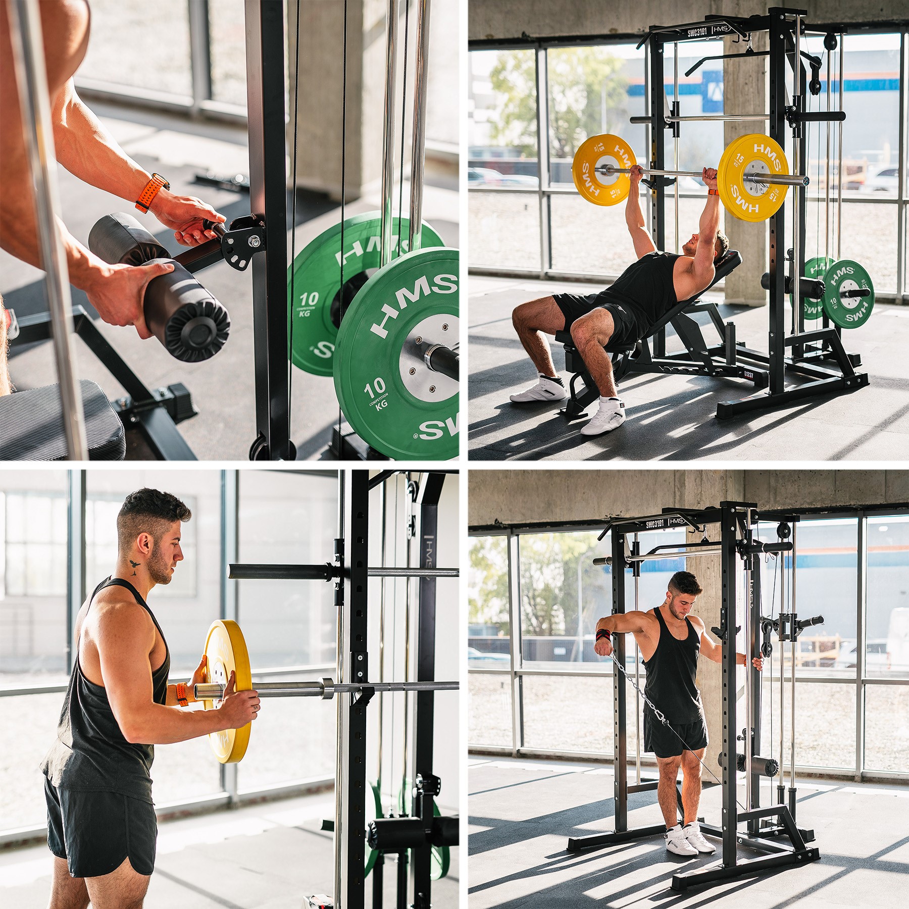 Ten model łączy trzy maszyny w jednym: klasyczną suwnicę Smitha (bezpieczny tor ruchu), klatkę pod sztangę (half-rack) oraz wyciąg górny i dolny oparty o wolny ciężar. W praktyce oznacza to, że jedno stanowisko wystarczy, by wykonać praktycznie każdy trening - od przysiadów, wyciskania czy martwego ciągu, przez ćwiczenia pleców, ramion i barków, po izolacje, pracę nad core czy funkcjonalne ruchy z linkami.