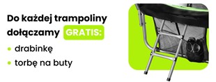 W komplecie z trampoliną otrzymujesz wszystko, co potrzebne do szybkiego montażu. Dodatkowo w zestawie znajduje się drabinka ułatwiająca wchodzenie oraz worek na buty, który pomaga utrzymać porządek wokół trampoliny. To detale, które realnie zwiększają komfort użytkowania od pierwszego dnia.