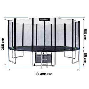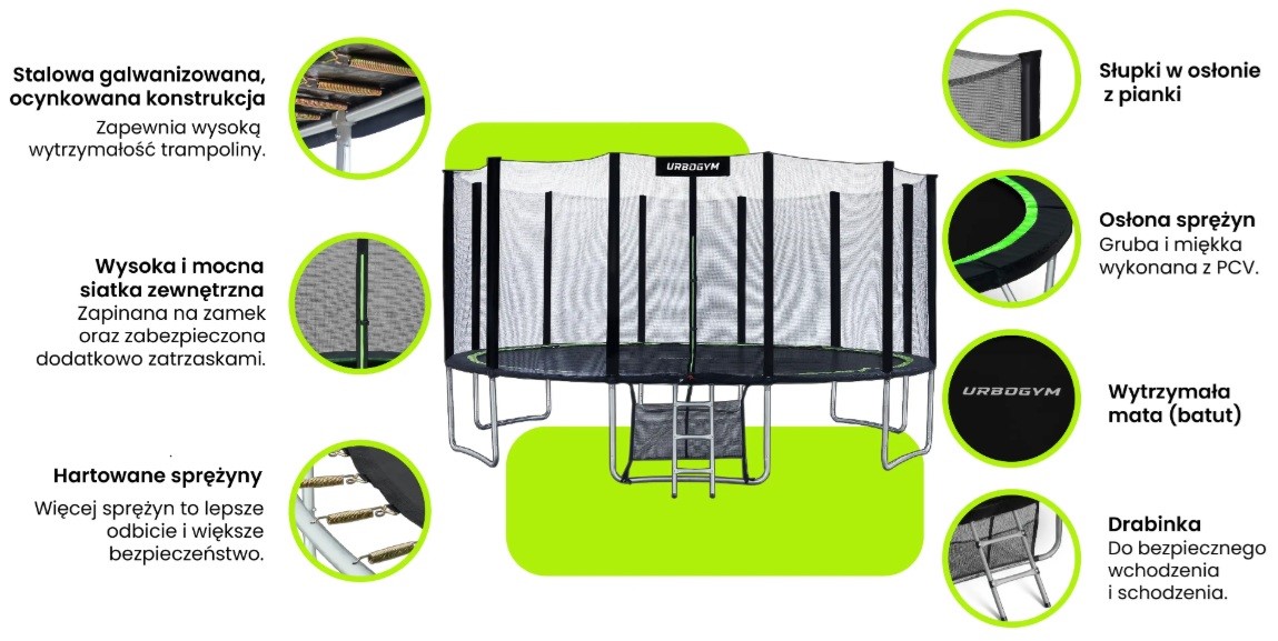 Wysoka siatka zabezpieczająca (180 cm) z trwałego polietylenu chroni użytkowników podczas skakania, a jej zamknięcie na zamek i dodatkowe zatrzaski zwiększają kontrolę nad wejściem. Słupki zostały pokryte grubą pianką EVA, która amortyzuje ewentualne uderzenia. Osłona sprężyn z wypełnieniem o grubości 12 mm skutecznie zabezpiecza newralgiczne elementy konstrukcji.