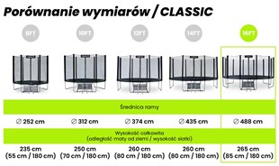 Średnica aż 488 cm oraz mata o powierzchni 433 cm dają ogromną swobodę ruchu - zarówno dzieciom, jak i dorosłym. 108 hartowanych sprężyn odpowiada za sprężystość i dynamikę odbicia, dzięki czemu każdy skok jest płynny i satysfakcjonujący. To idealne warunki do aktywnej zabawy i poprawy kondycji.
