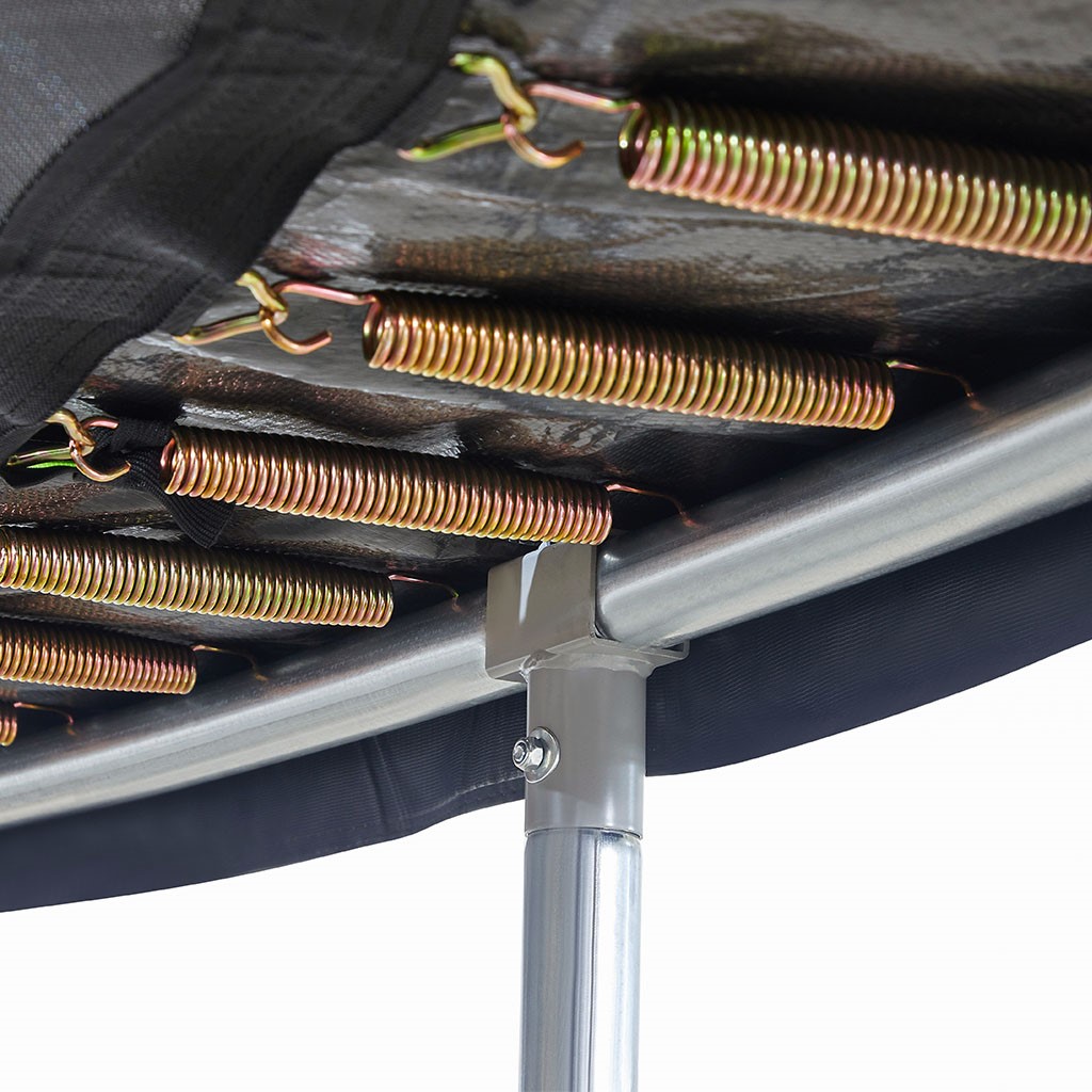 Rama wykonana z galwanizowanej i ocynkowanej stali została zaprojektowana z myślą o wielosezonowym użytkowaniu na świeżym powietrzu. System 6 podwójnych nóg w kształcie „U” zapewnia pewne oparcie nawet podczas intensywnego użytkowania, a maksymalne obciążenie do 150 kg pozwala korzystać z trampoliny całej rodzinie.
