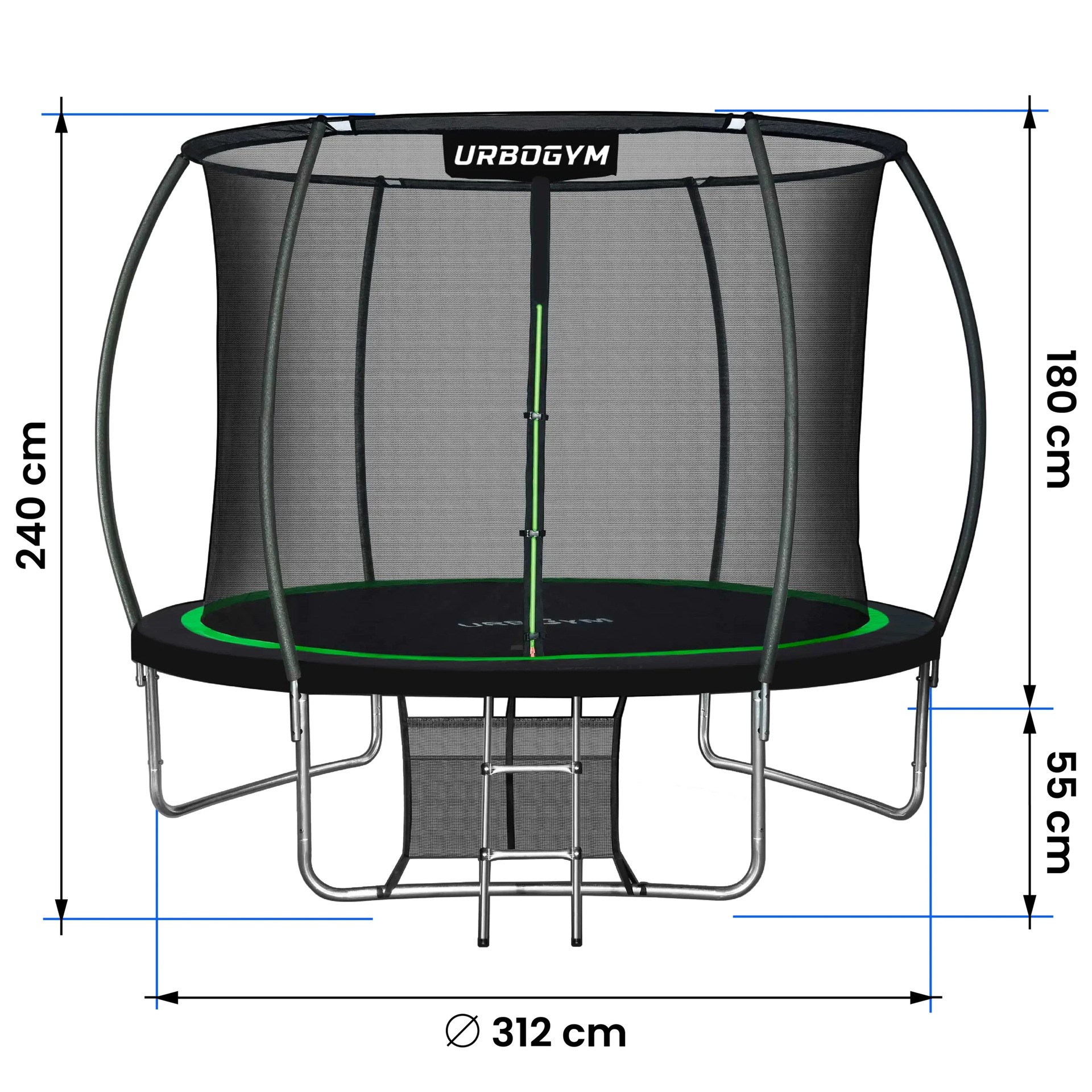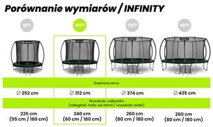 UrboGym Infinity 10ft oferuje optymalną średnicę 312 cm, która zapewnia dużą swobodę ruchu, a jednocześnie dobrze wpisuje się w przestrzeń ogrodu. To model idealny dla dzieci, młodzieży, a także dorosłych, którzy chcą aktywnie spędzać czas razem.