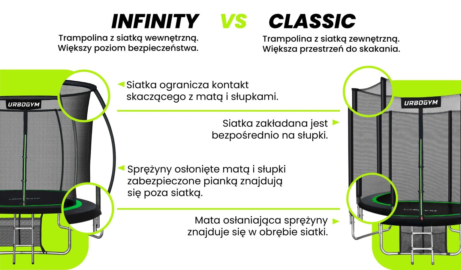 Jeśli szukasz trampoliny, która zapewni prawdziwą swobodę ruchu i wspólną zabawę dla całej rodziny - UrboGym Infinity 12ft spełni te oczekiwania. To model, który zamienia ogród w aktywną strefę pełną energii, śmiechu i codziennych wyzwań ruchowych.