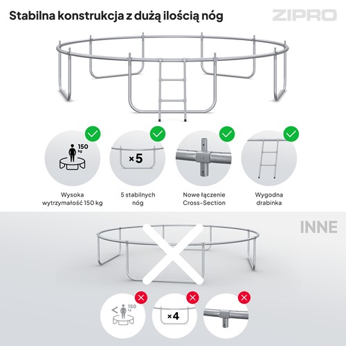 | W trampolinach ZIPRO została zwiększona liczba nóg, w porównaniu z innymi produktami. Siły działające na konstrukcję podczas skoków są dzięki temu lepiej rozkładane i obciążenie jest równomierne, zapewniając stabilność i bezpieczeństwo. Wykonane są one, podobnie jak rama, z odpornej na czynniki atmosferyczne stali ocynkowanej. |
