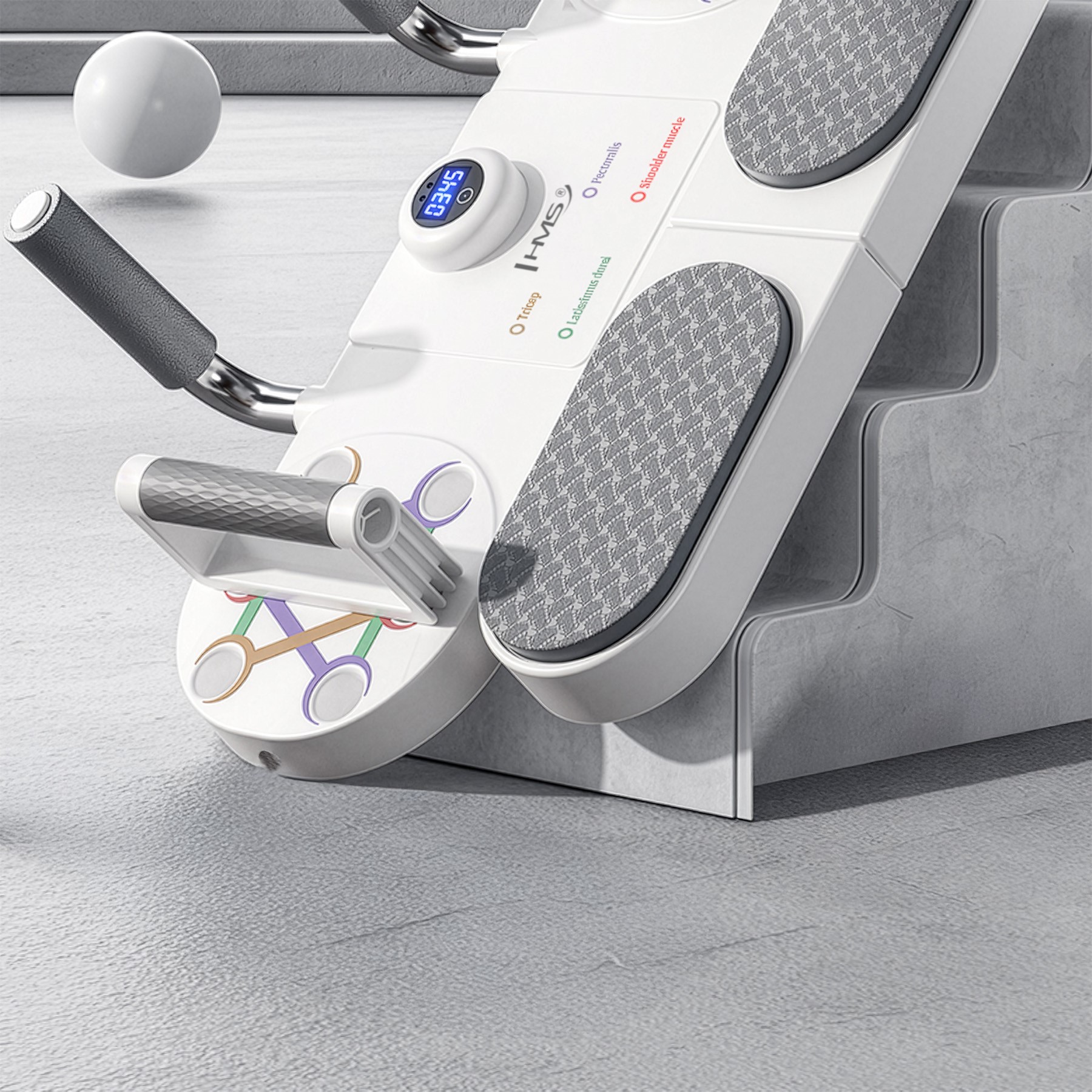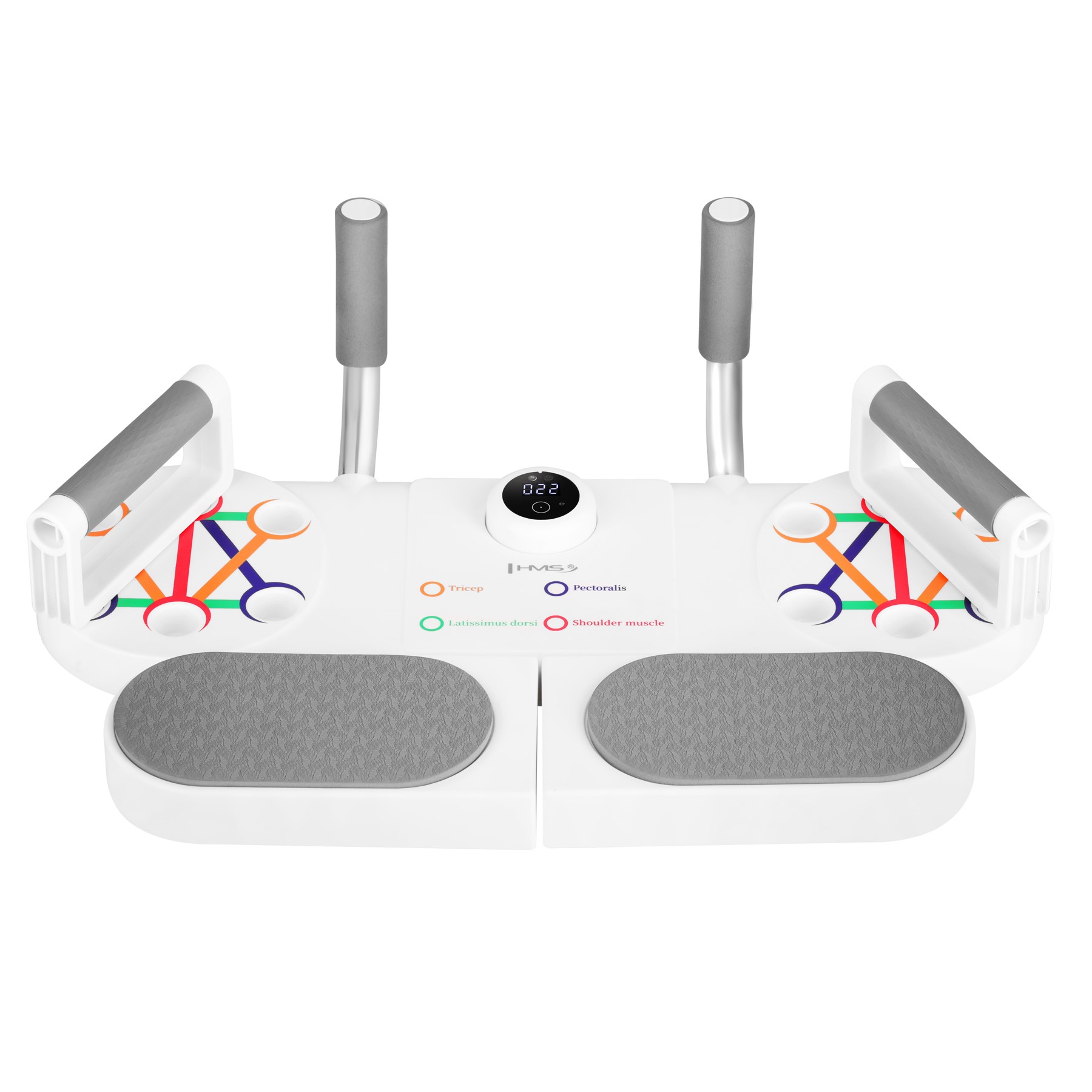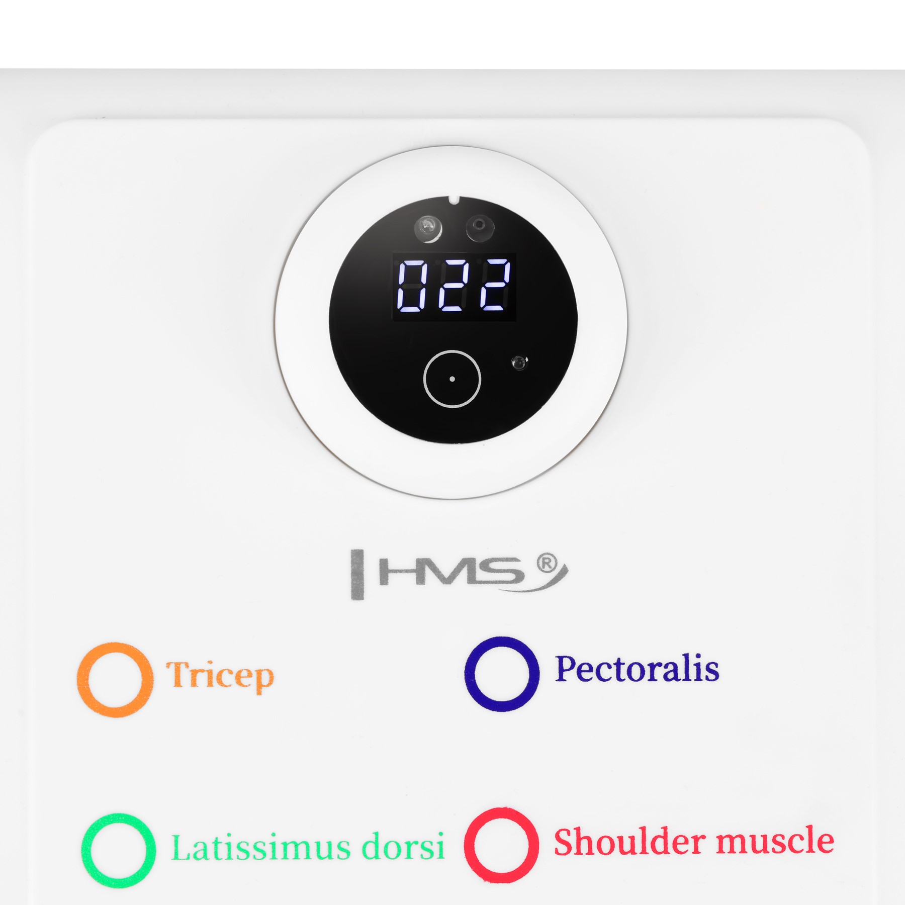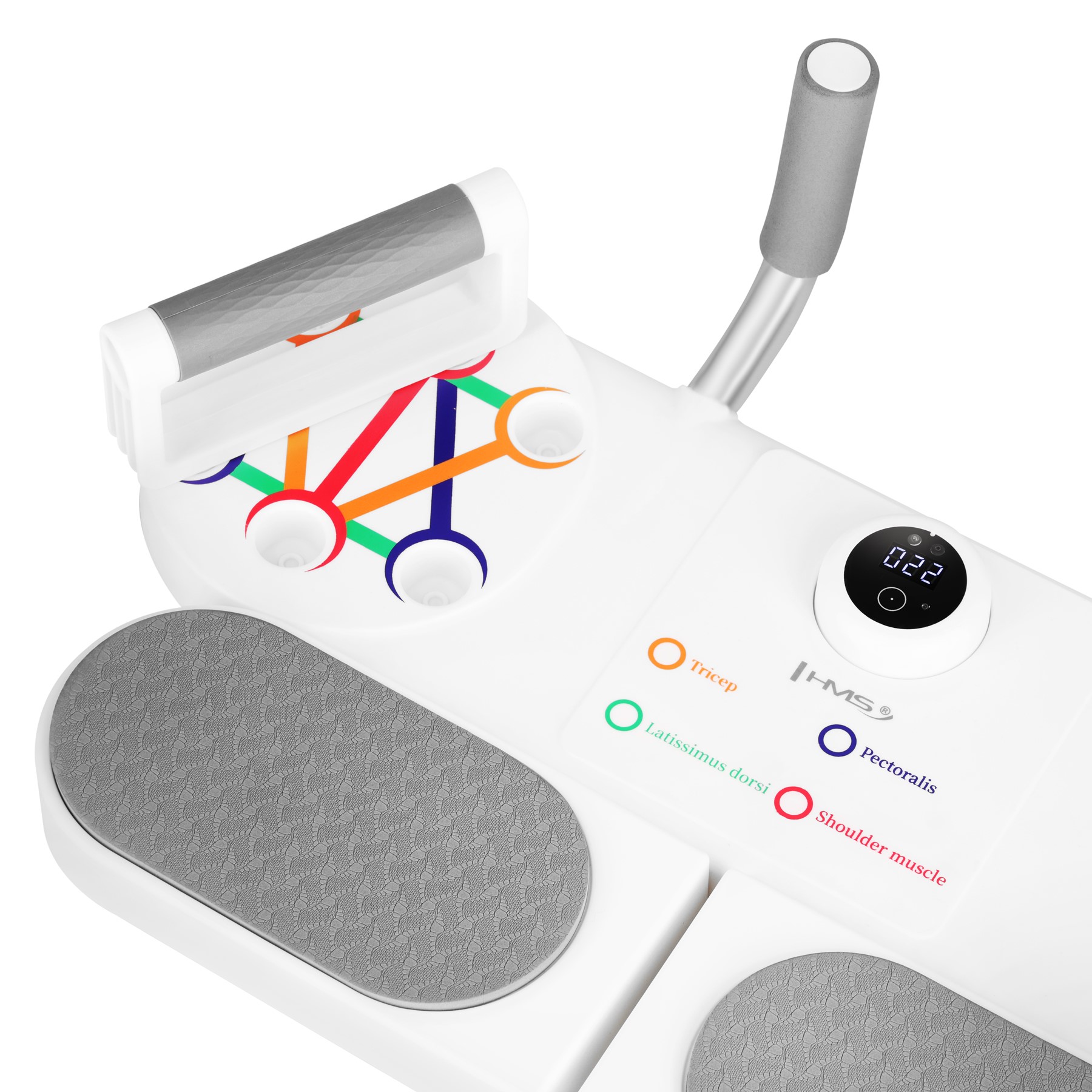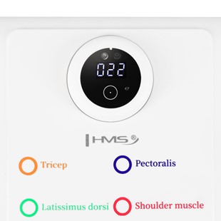 | Optyczny (IR) czujnik zbliżeniowy wykrywa każde zejście w dół i automatycznie liczy powtórzenia; wyświetlacz pokazuje wynik serii. |